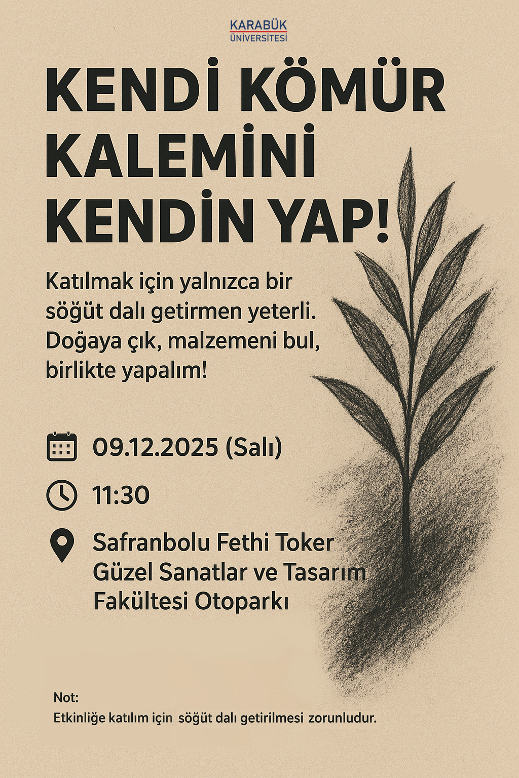 Dr. Öğr. Üyesi Mustafa Tunç tarafından Kendi Kömür Kalemini Kendin Yap başlıklı etkinlik düzenlenmektedir. Planlanan etkinlik için sadece söğüt dalı getirilmesi yeterlidir.