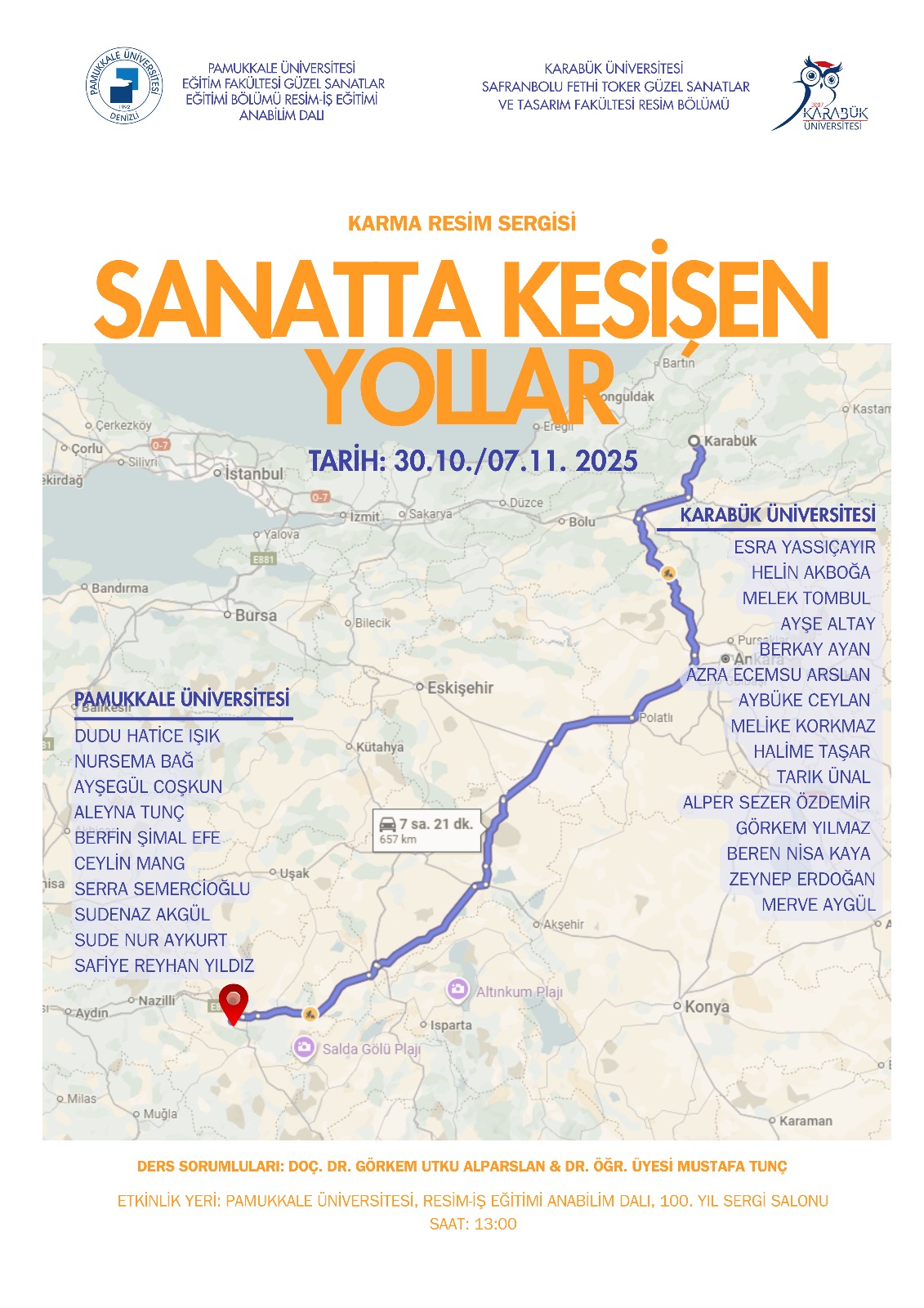Karabük Üniversitesi Safranbolu Fethi Toker Güzel Sanatlar ve Tasarım Fakültesi Resim Bölümü ile Pamukkale Üniversitesi Eğitim Fakültesi Resim-İş Eğitimi Anabilim Dalı iş birliğinde düzenlenen “Sanatta Kesişen Yollar” başlıklı karma serginin ikinci ayağı, 30 Ekim–7 Kasım 2025 tarihleri arasında Pamukkale Üniversitesi 100. Yıl Sergi Salonu’nda sanatseverlerle buluştu. Bölümümüz öğretim üyesi ders sorumlusu Dr. Öğr. Üyesi Mustafa TUNÇ ve Pamukkale Üniversitesi öğretim üyesi Doç. Dr. Görkem Utku ALPARSLAN Resim Atölye ders kapsamında öğrencileri bir araya getirerek gerçekleştirildi.