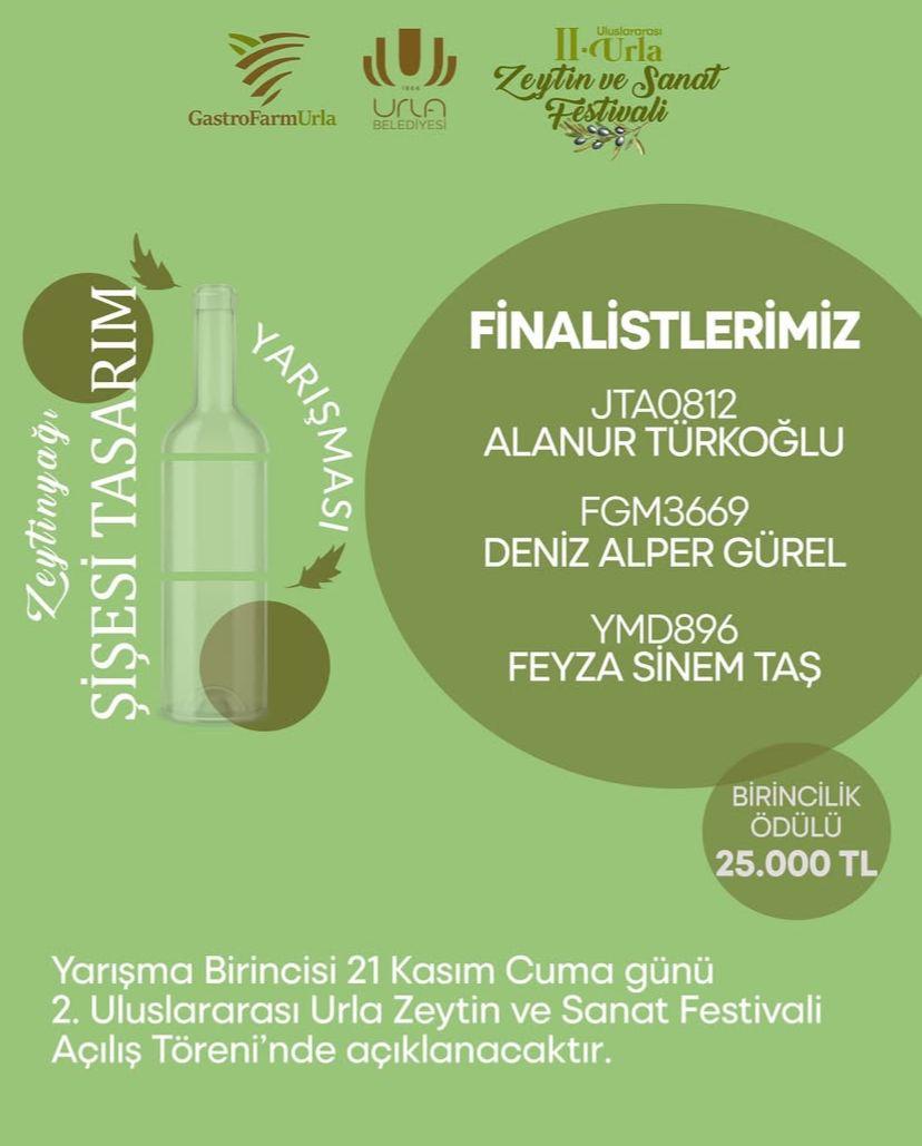 Urla Belediyesi tarafından 2. Uluslararası Urla zeytin ve sanat festivali kapsamında zeytin yağı şişe tasarım yarışmasında son sınıf öğrencilerimizden Feyza Sinem TAŞ tasarımı ile finale kaldı.