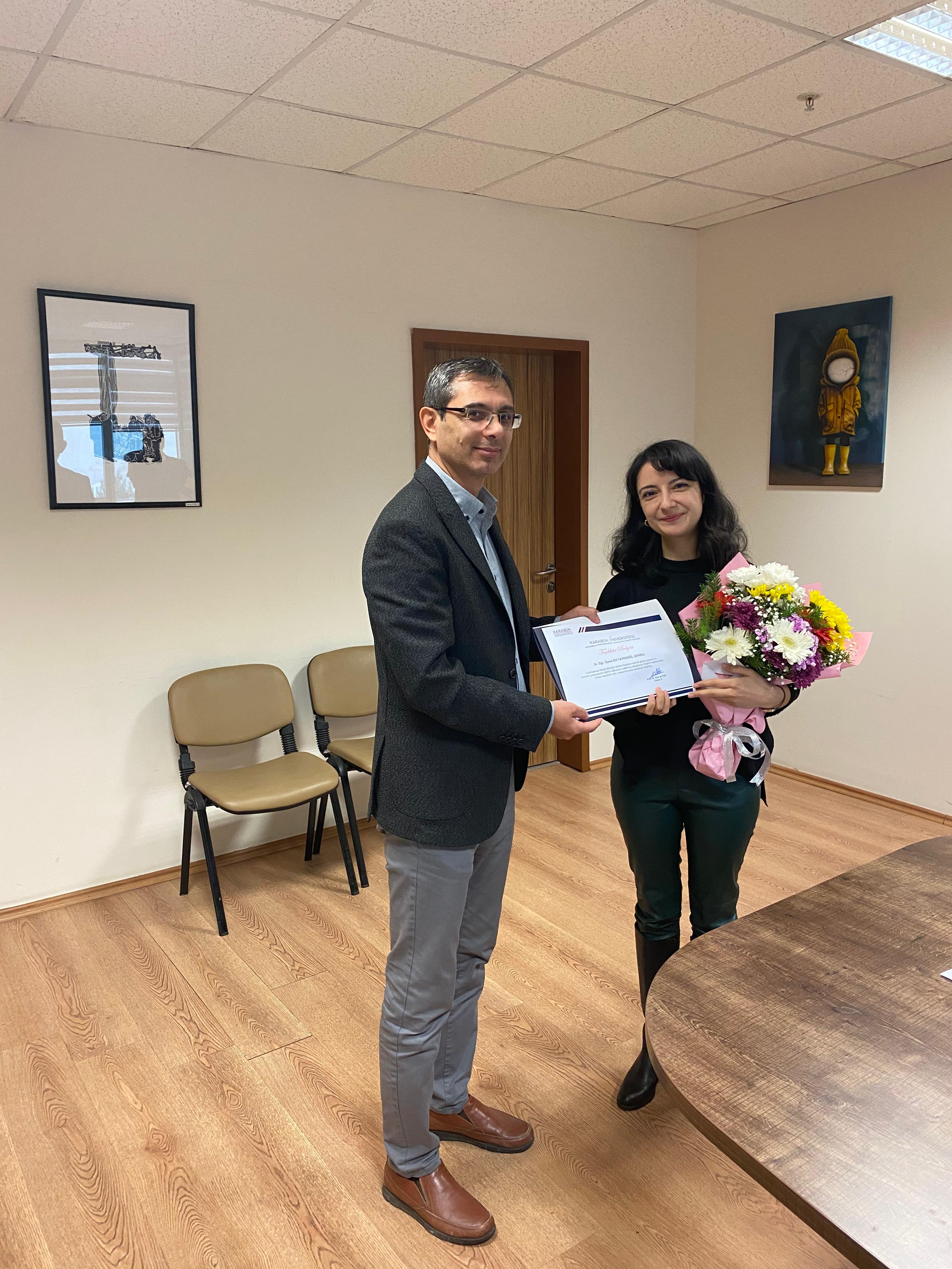 Fakültemiz Müzik Bölümü Bölüm Başkanlığında görev devir ve teslimi yapıldı. Müzik Bölümü Başkanı Dr. Öğr. Üyesi Elif Yaygıngöl Şehirli Başkanlık görevini Dr.Öğr.Üyesi Hacısüleymanoğlu’na devretti. Fakültemiz Dekanı Prof.Dr. Suat Altun,Yaygıngöl’e vermiş olduğu hizmetlerden dolayı teşekkür etti ve teşekkür belgesi takdim etti.