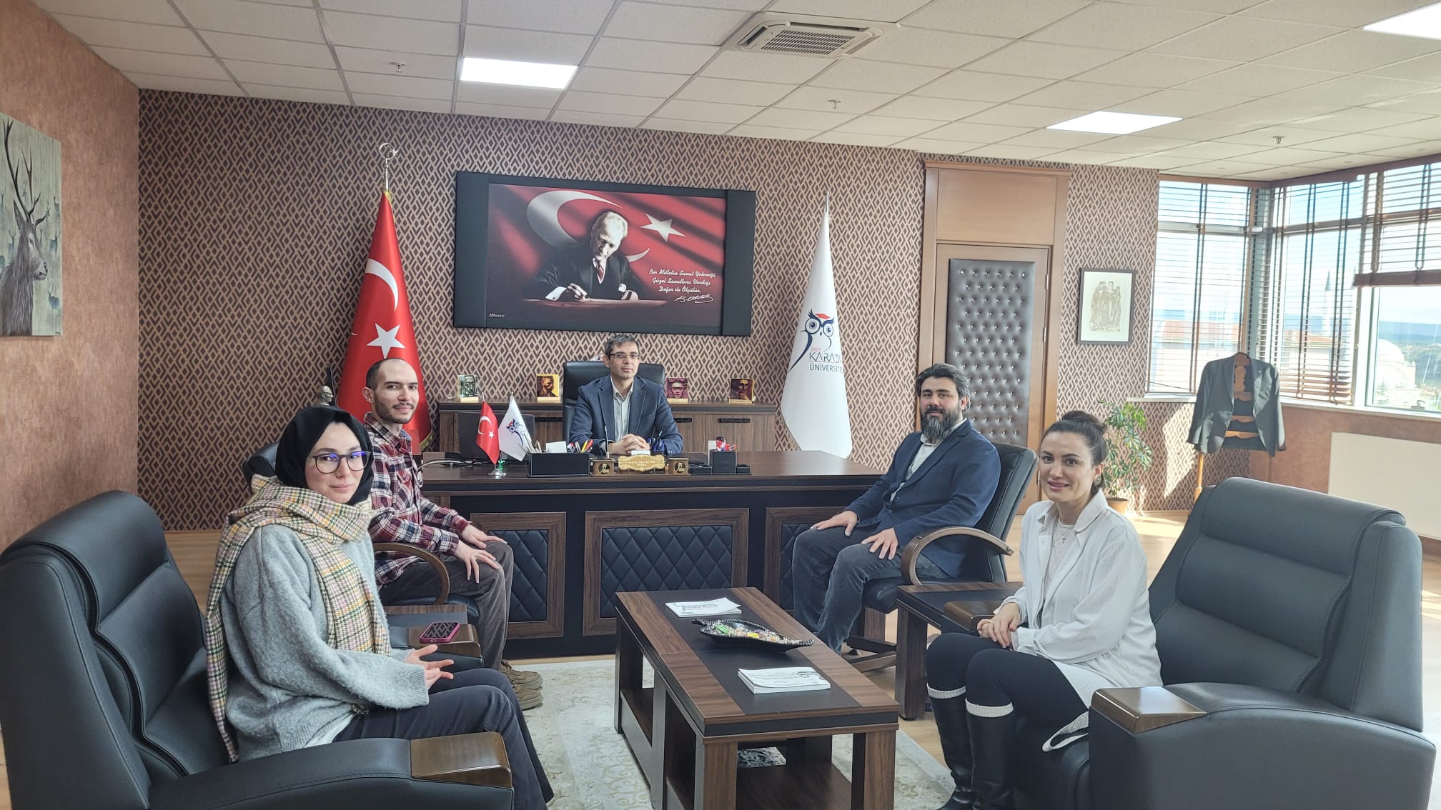 Fakültemize yeni atanan Müzik Bölümü Dr. Öğretim Üyesi Şükriye Tuğçe RENDA, Müzik Bölümü Dr. Öğretim Üyesi Emin Abdülkadir ÇOLAKOĞLU, Grafik Tasarımı Öğretim Görevlisi Hasan YILMAZ ve Endüstriyel Tasarım Bölümü Araştırma Görevlisi Ümran KOCAKURT atanmaları dolayısıyla Fakülte Dekanı Prof. Dr. Suat Altun’u makamında ziyaret etti.